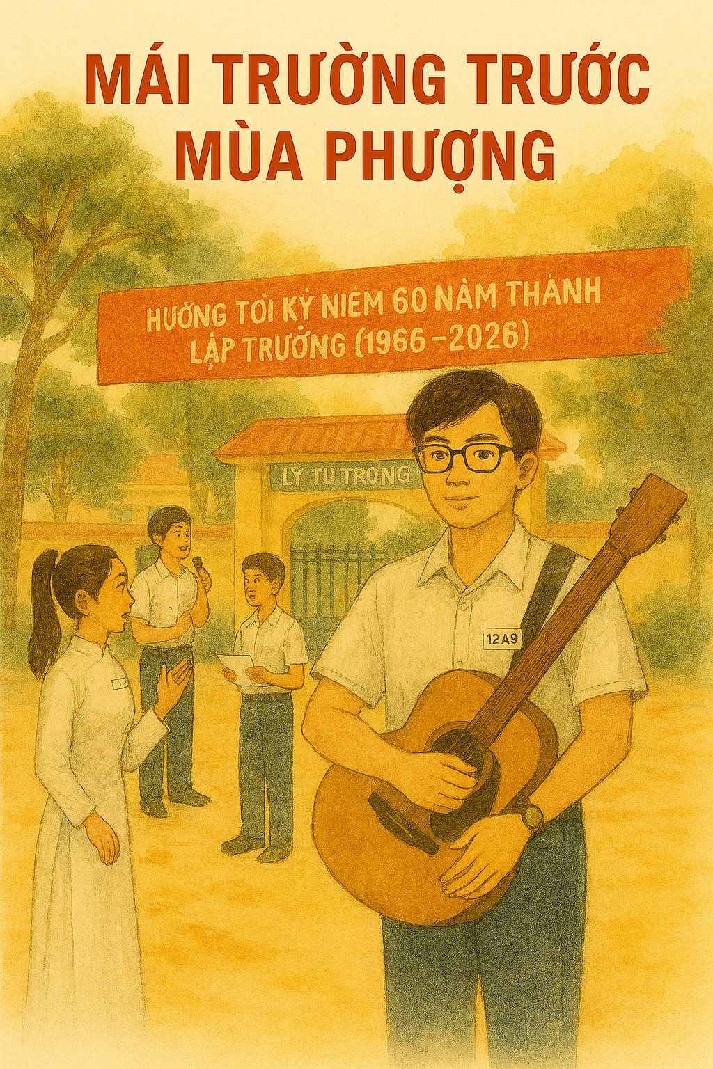 Sân trường THPT Lý Tự Trọng tháng Ba, nắng mới lên trên tán bàng non và tiếng loa phát thử chương trình buổi sáng. Tôi đứng dưới chiếc băng-rôn đỏ căng ngang cổng — “Hướng tới kỷ niệm 60 năm thành lập trường (1966–2026)” — mà ngỡ như đang nhìn thấy tuổi mười bảy của mình được viết lên đó. Mỗi ngày đến lớp, tôi lại thấy con số sáu mươi ấy gần hơn, còn tôi thì vẫn là cậu học trò lớp 12A8, đeo bảng tên đã hơi xước, ôm cây guitar cũ sờn mép, chuẩn bị cho buổi tập văn nghệ.